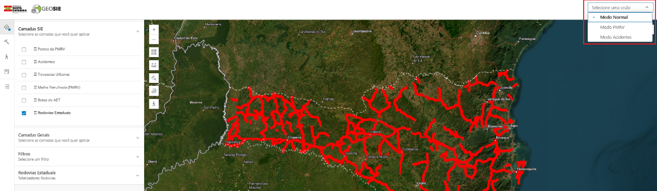 Para facilitar a utilização do GeoSIE para grupos específicos de usuários, está disponível, no canto superior direito da interface, um comando para o estabelecimento de modos de utilização predefinidos.